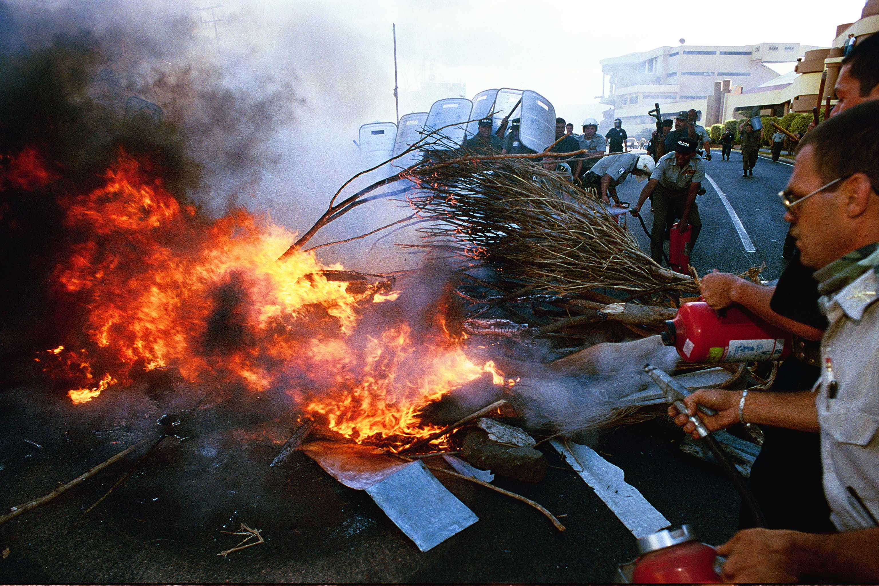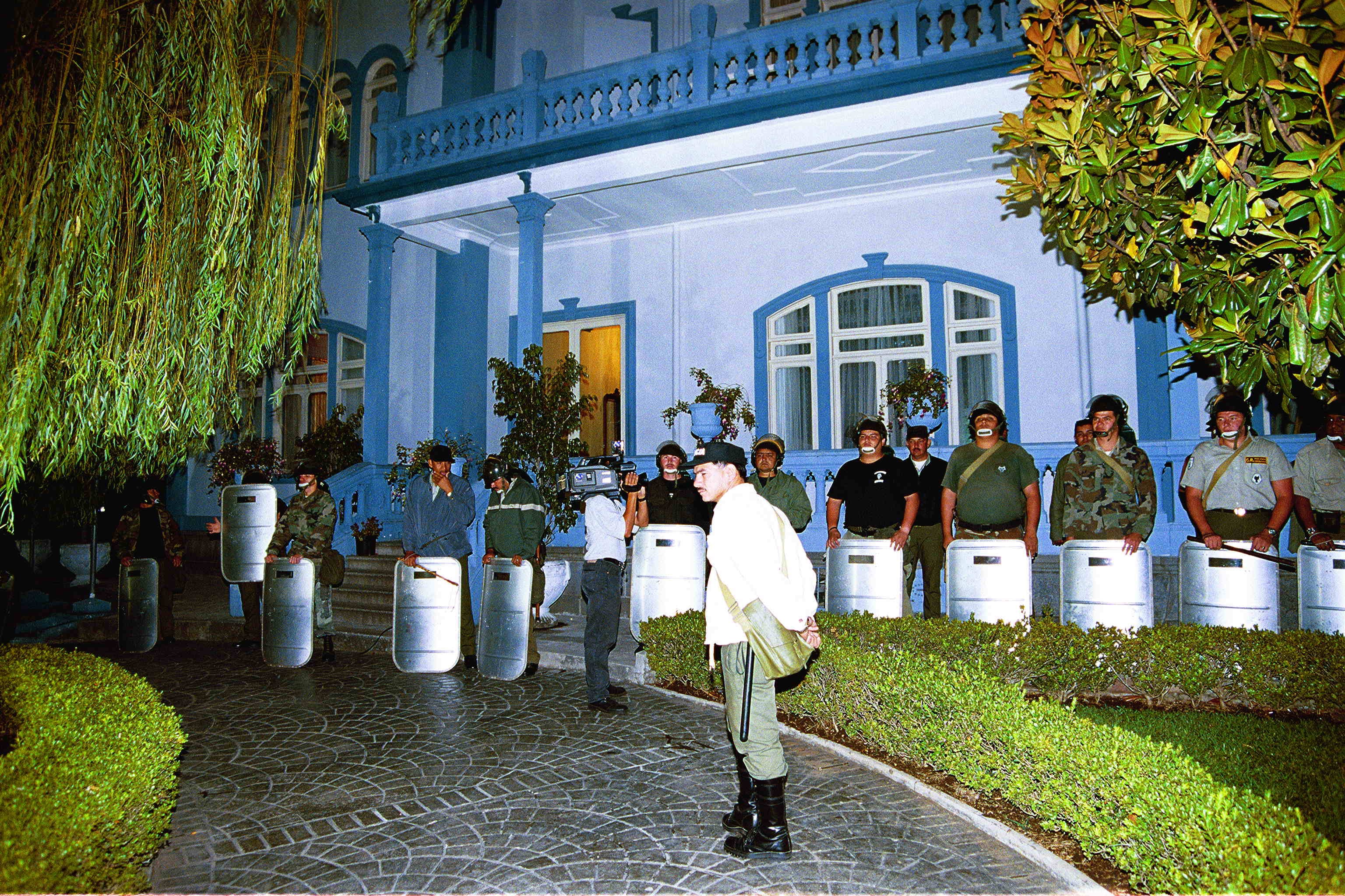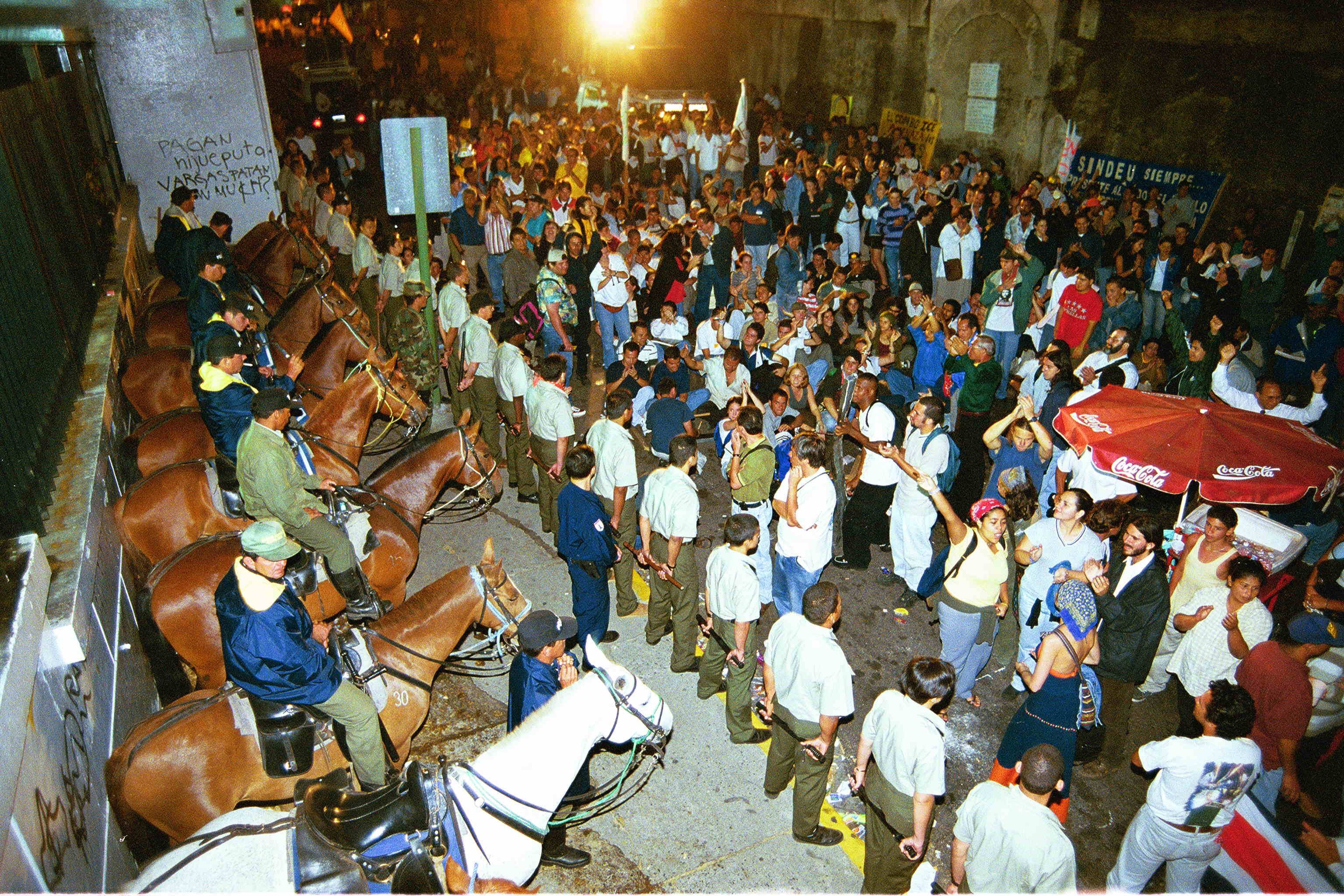 Policías armados con bombas lacrimógenas y equipos antimotines custodian el edificio mientras cientos de personas se manifiestan afuera. El escenario es la Asamblea Legislativa en la San José del año 2000.