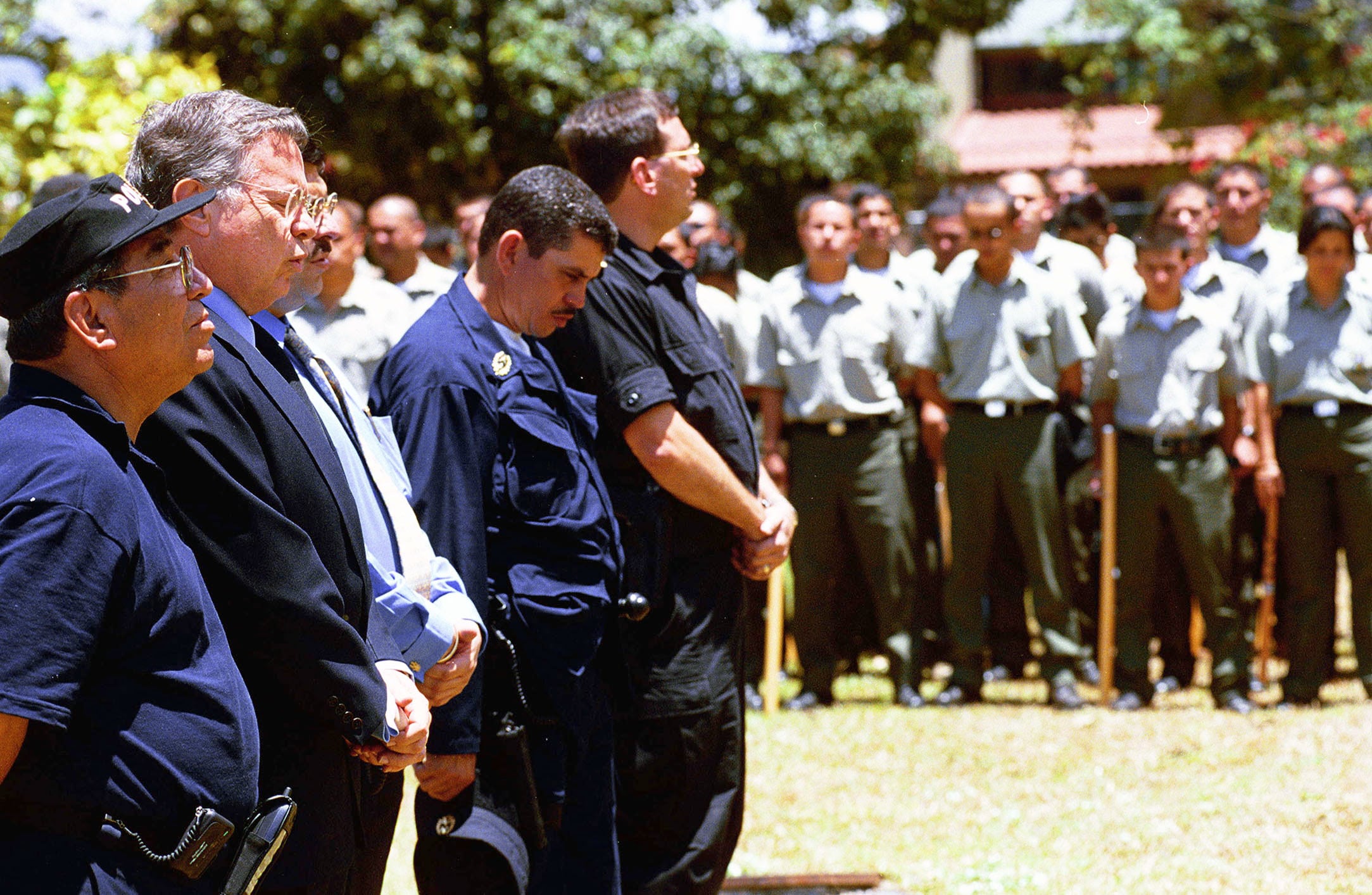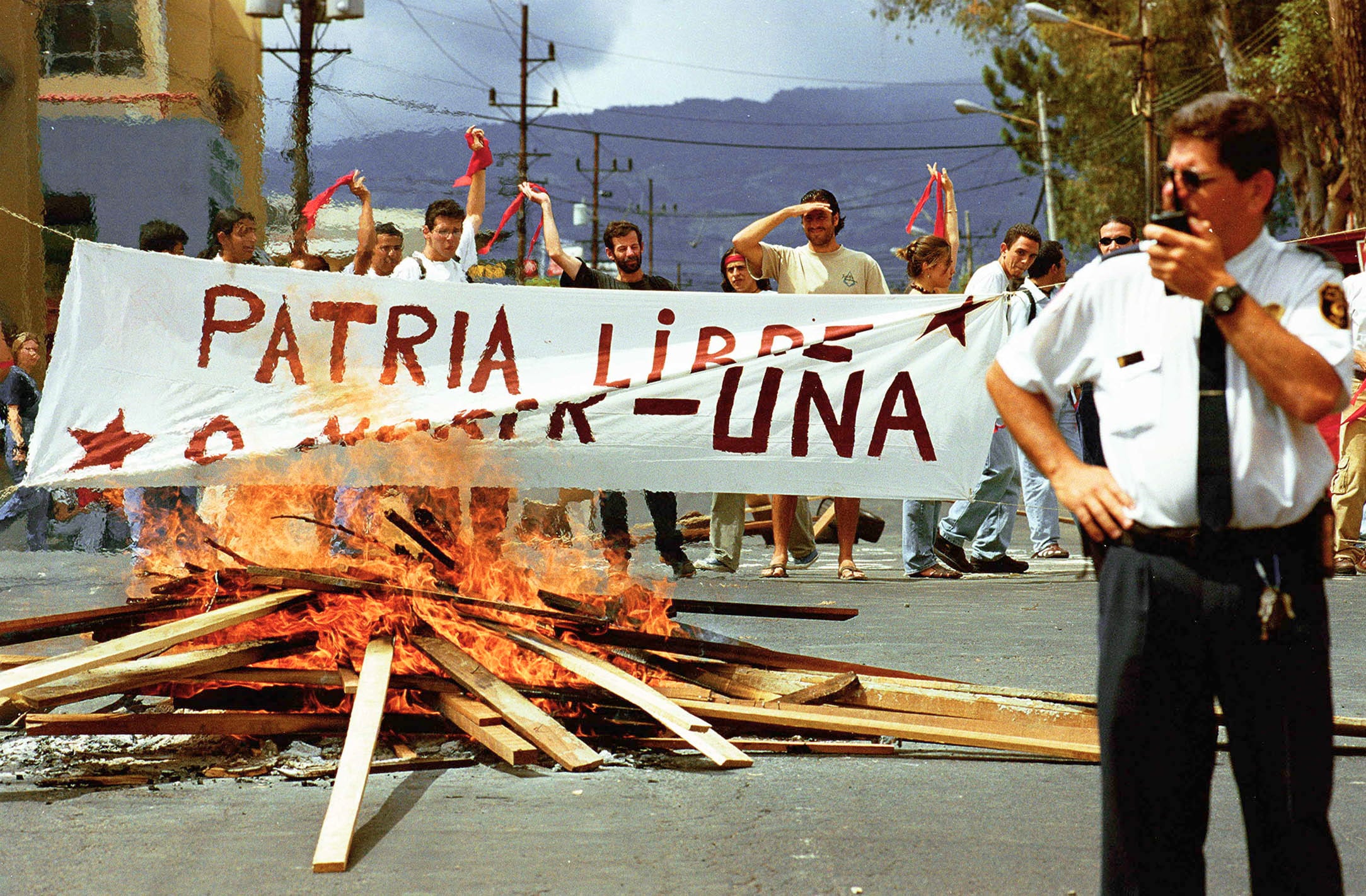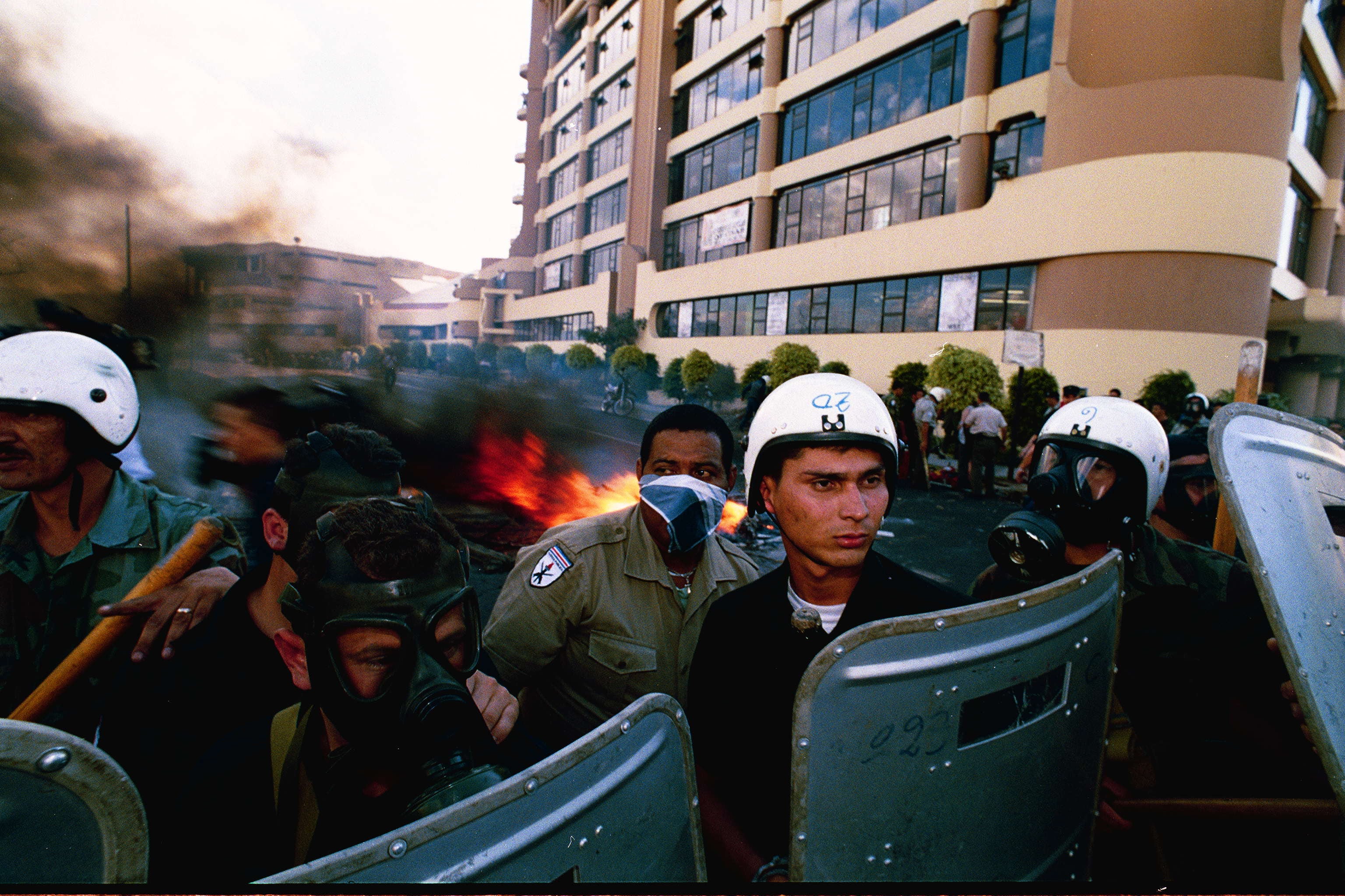 Policías armados con bombas lacrimógenas y equipos antimotines custodian el edificio mientras cientos de personas se manifiestan afuera. El escenario es la Asamblea Legislativa en la San José del año 2000.