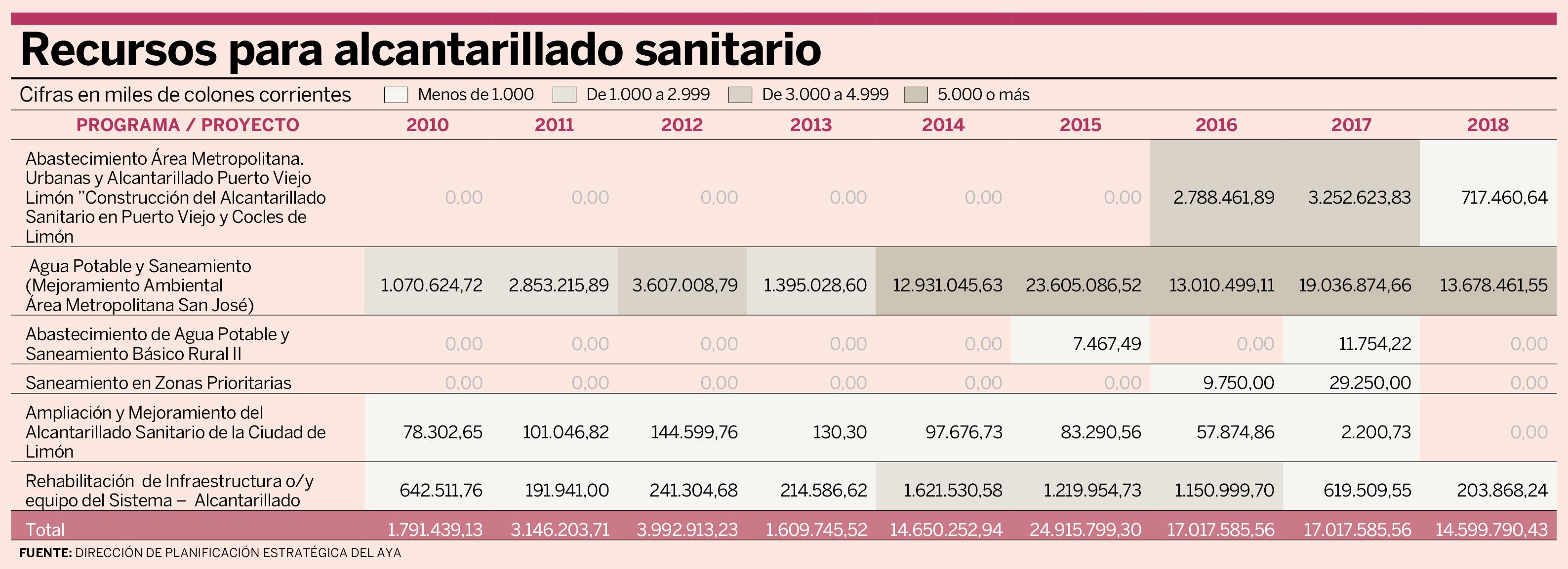 El rezago histórico se refleja en el comportamiento de las inversiones de los últimos años. En el 2018 el Instituto Costarricense de Acueductos y Alcantarillados (AyA) destinó ¢14.599 millones a tres proyectos, lo que representó una contracción del 36% en comparación con los ¢22.952 millones que se usaron en el 2017, según datos de la entidad.