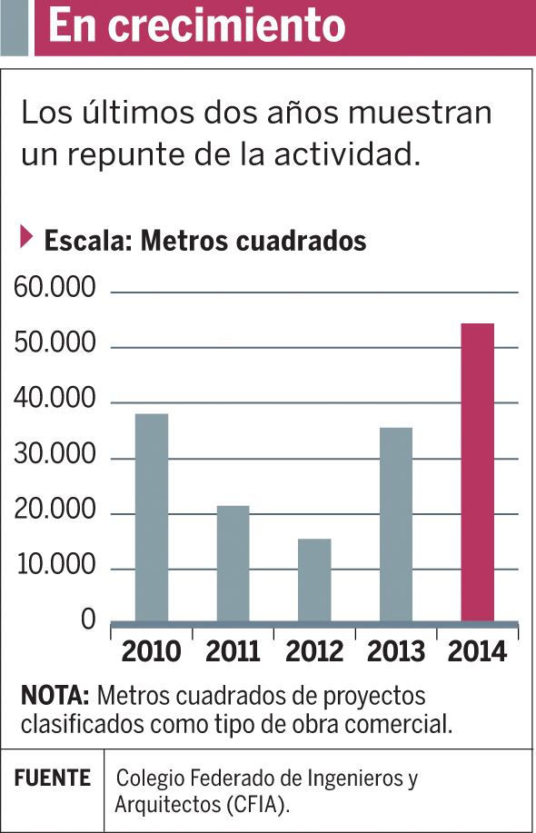 Según datos del Colegio Federado de Ingenieros y Arquitectos (CFIA), la cantidad de metros cuadrados para proyectos comerciales creció un 250% en dos años. En el 2012 fueron 15.522 mientras que para 2014 la cifra fue de 54.387.
