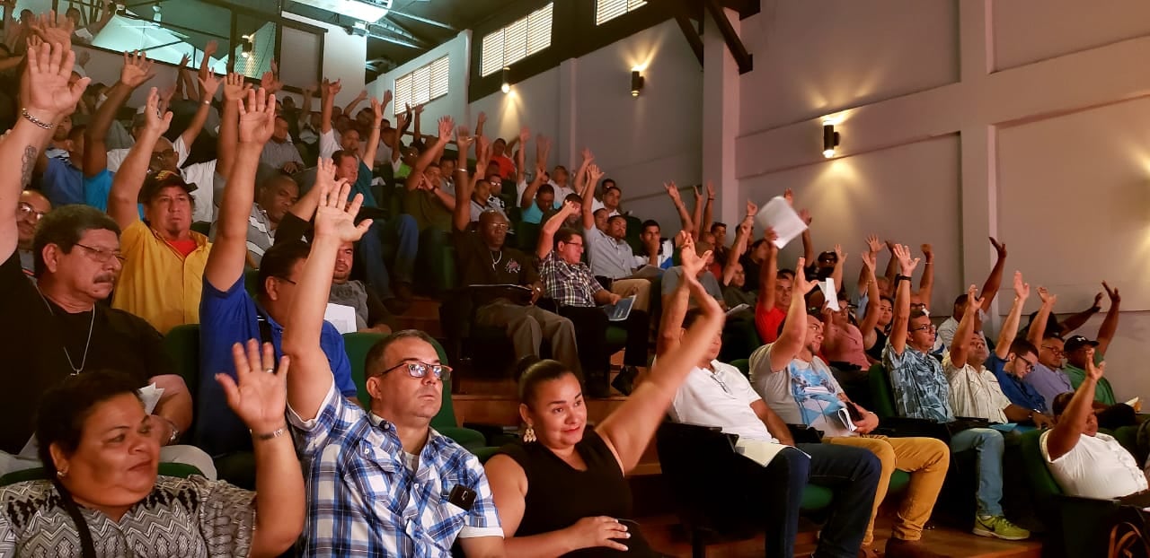 En una cooperativa, cada asociado tiene derecho a voto, en igualdad de condiciones. Esta imagen corresponde a la formación de la Cooperativa Autogestionaria de Servicios Múltiples de Trabajadores Industriales y Afines de Costa Rica (Coopesitraco R.L.), compuesta por el personal que despidió la empresa Dole en Limón en 2019. Foto: Cortesía David Gourzong ( Cortesía David Gourzong)