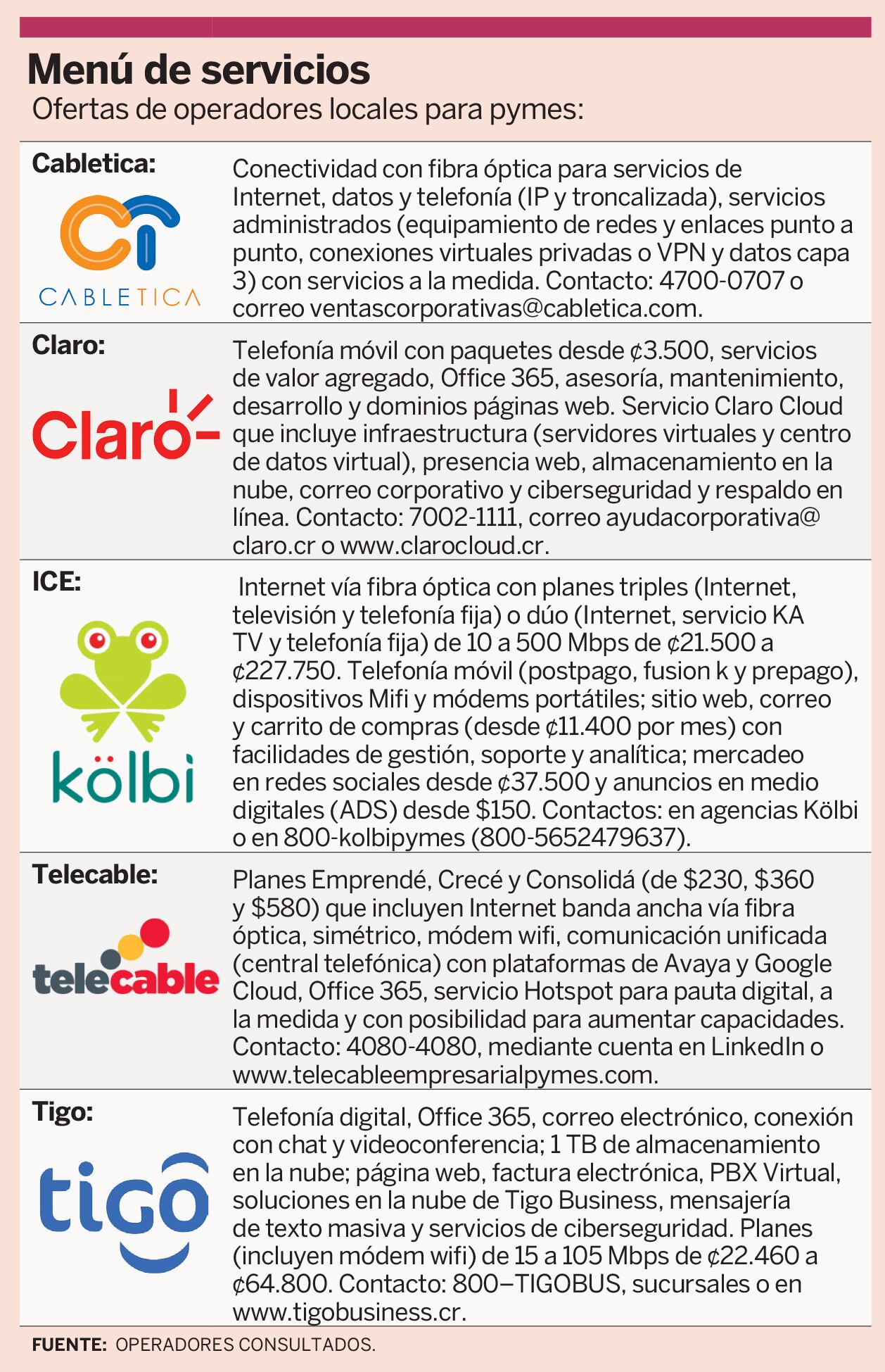 Cabletica, Claro, el Instituto Costarricense de Electricidad (ICE), Telecable y Tigo disponen de servicios con características que se ajustan a las necesidades, incluyendo pago según la demanda o uso.